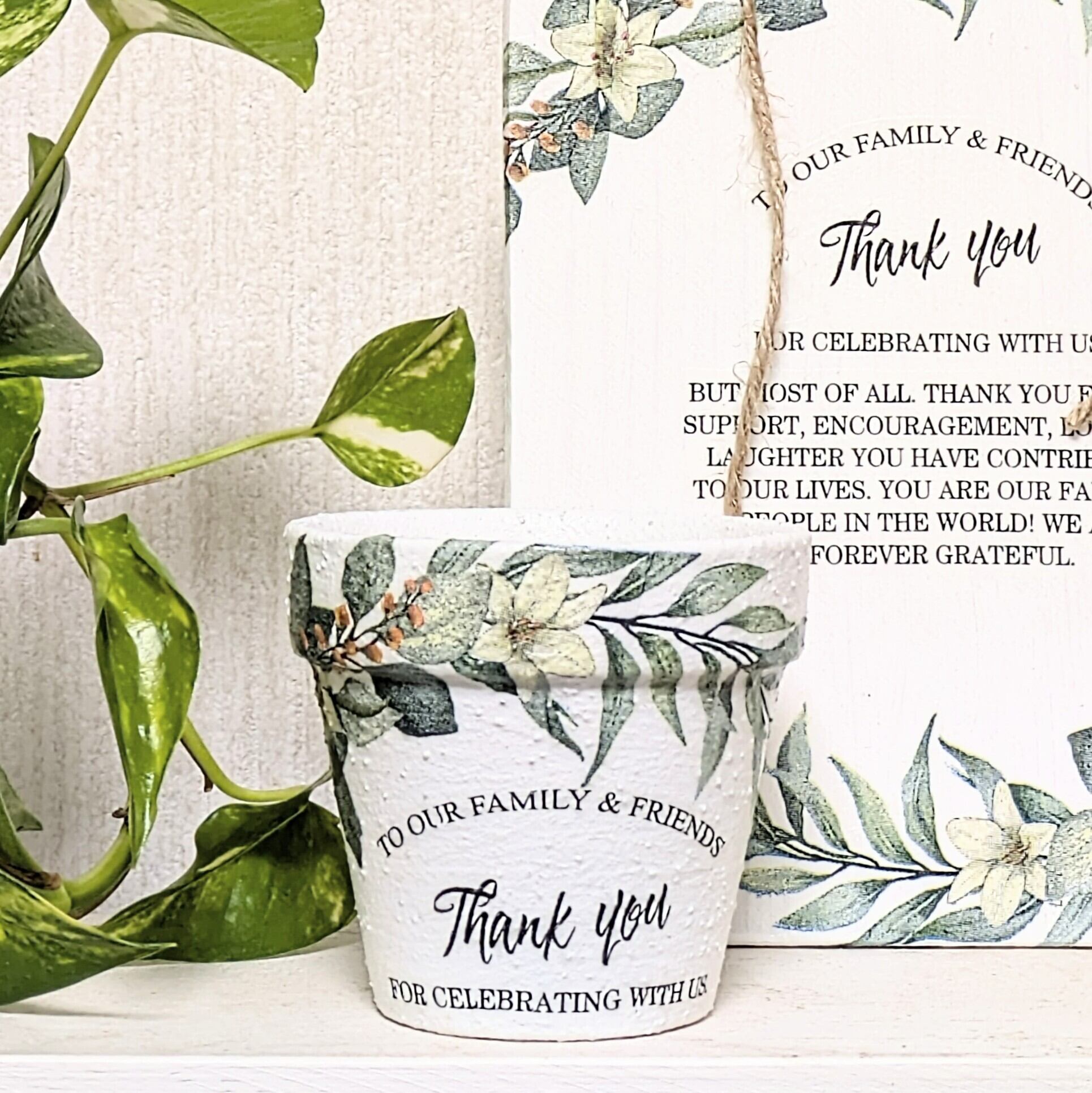 素焼き鉢にザラザラのペイントをし、ボタニカル柄と英文字をデコパージュしました。