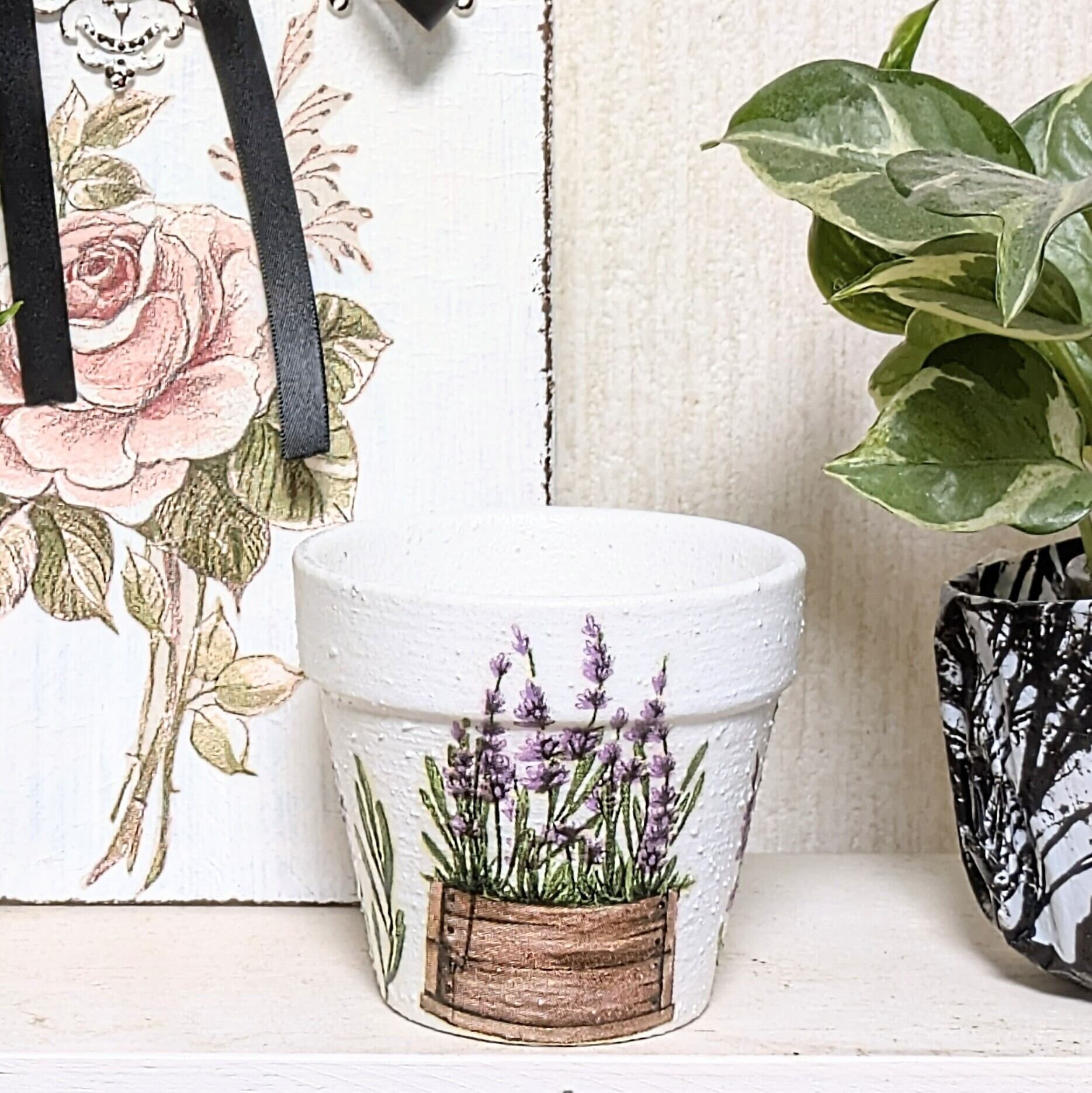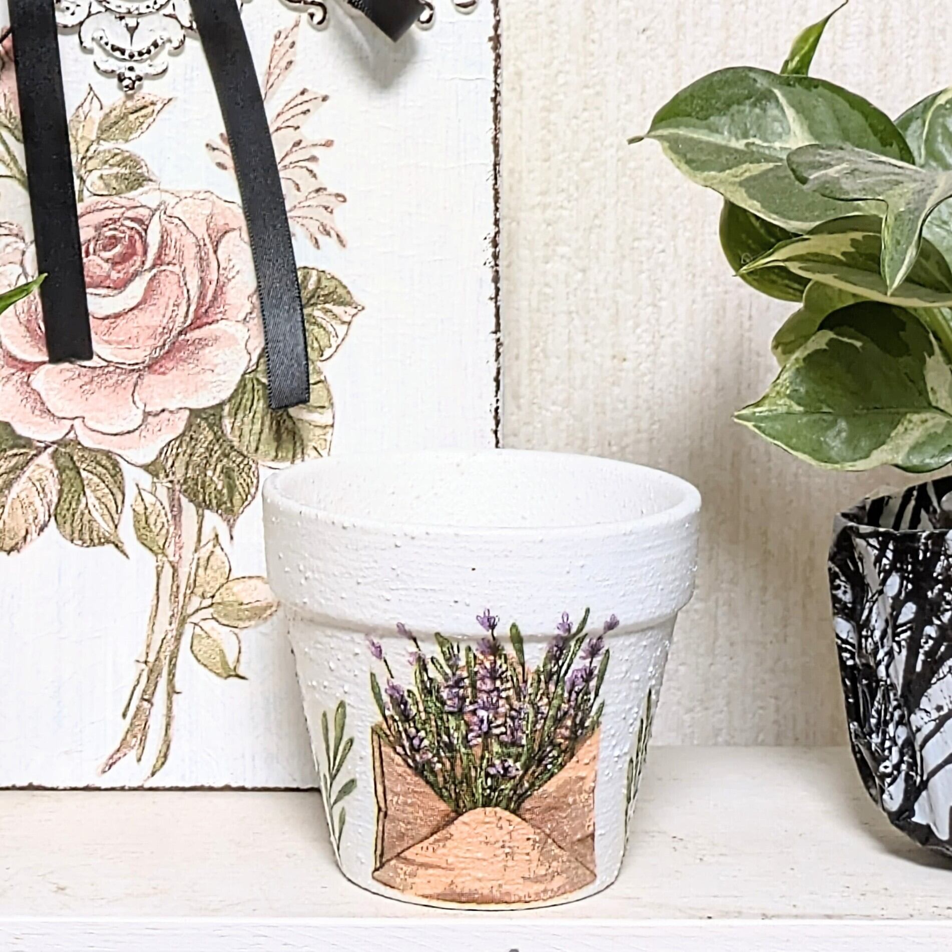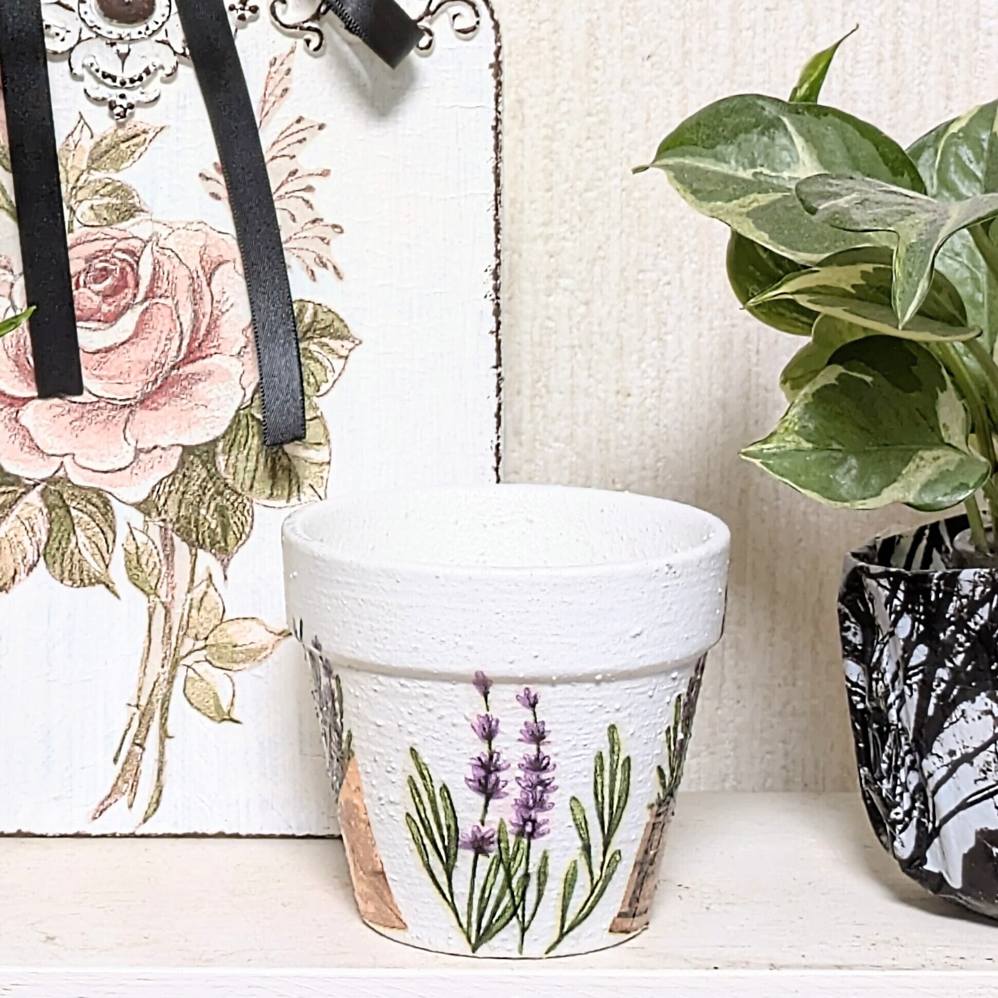 素焼き鉢にザラザラのペイントをし、ラベンダー柄をデコパージュしました。