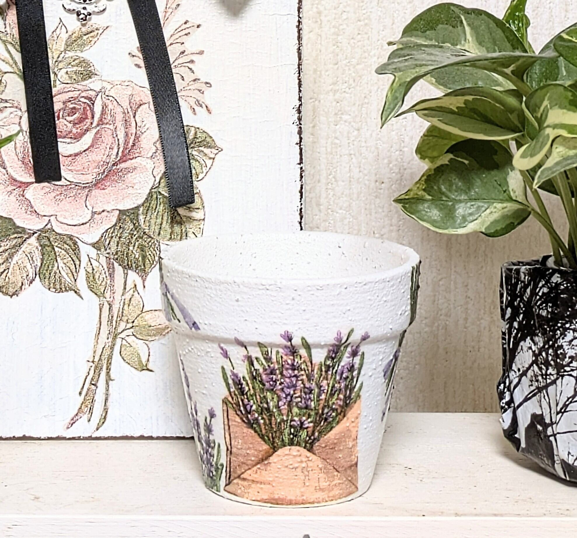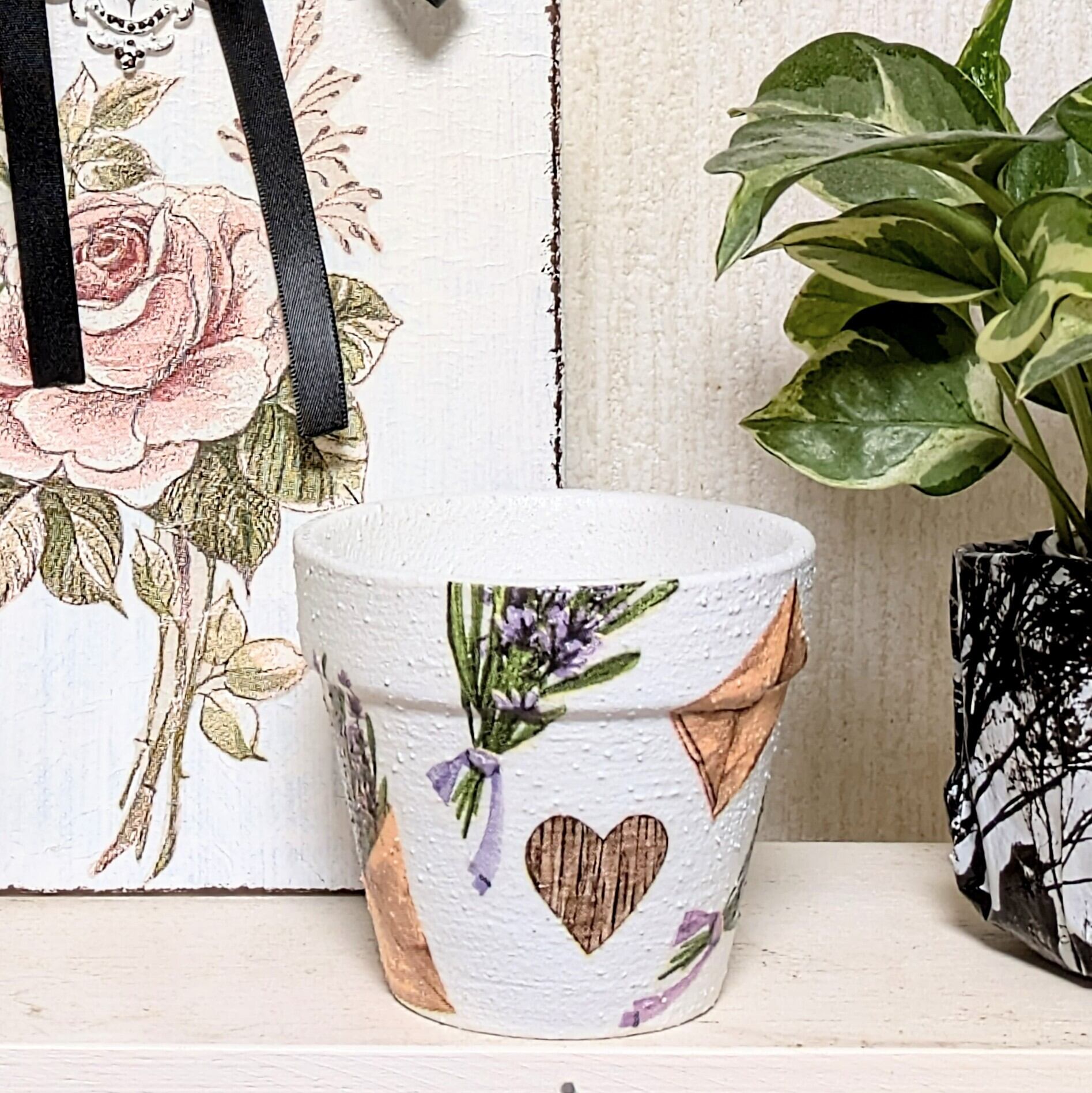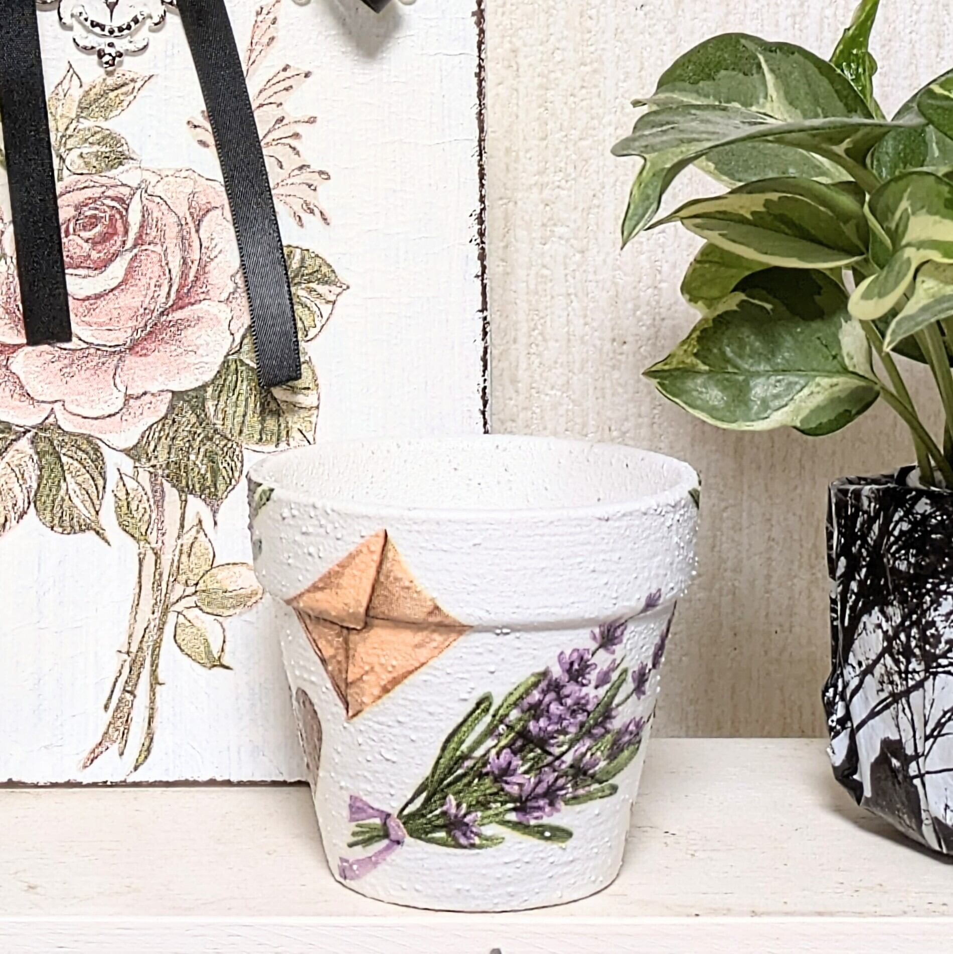 素焼き鉢にザラザラのペイントをし、ラベンダー柄をデコパージュしました。