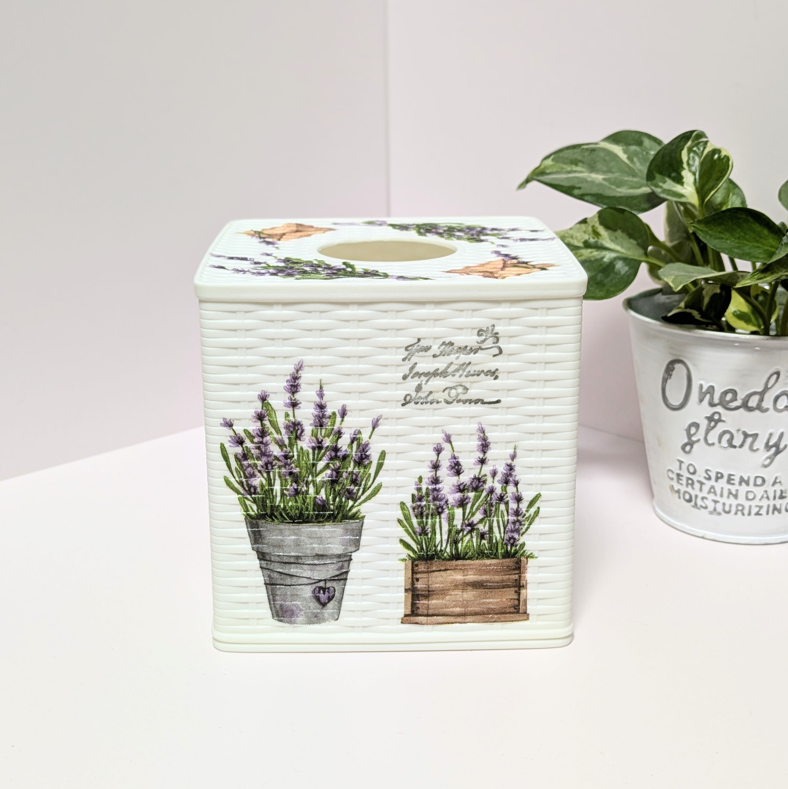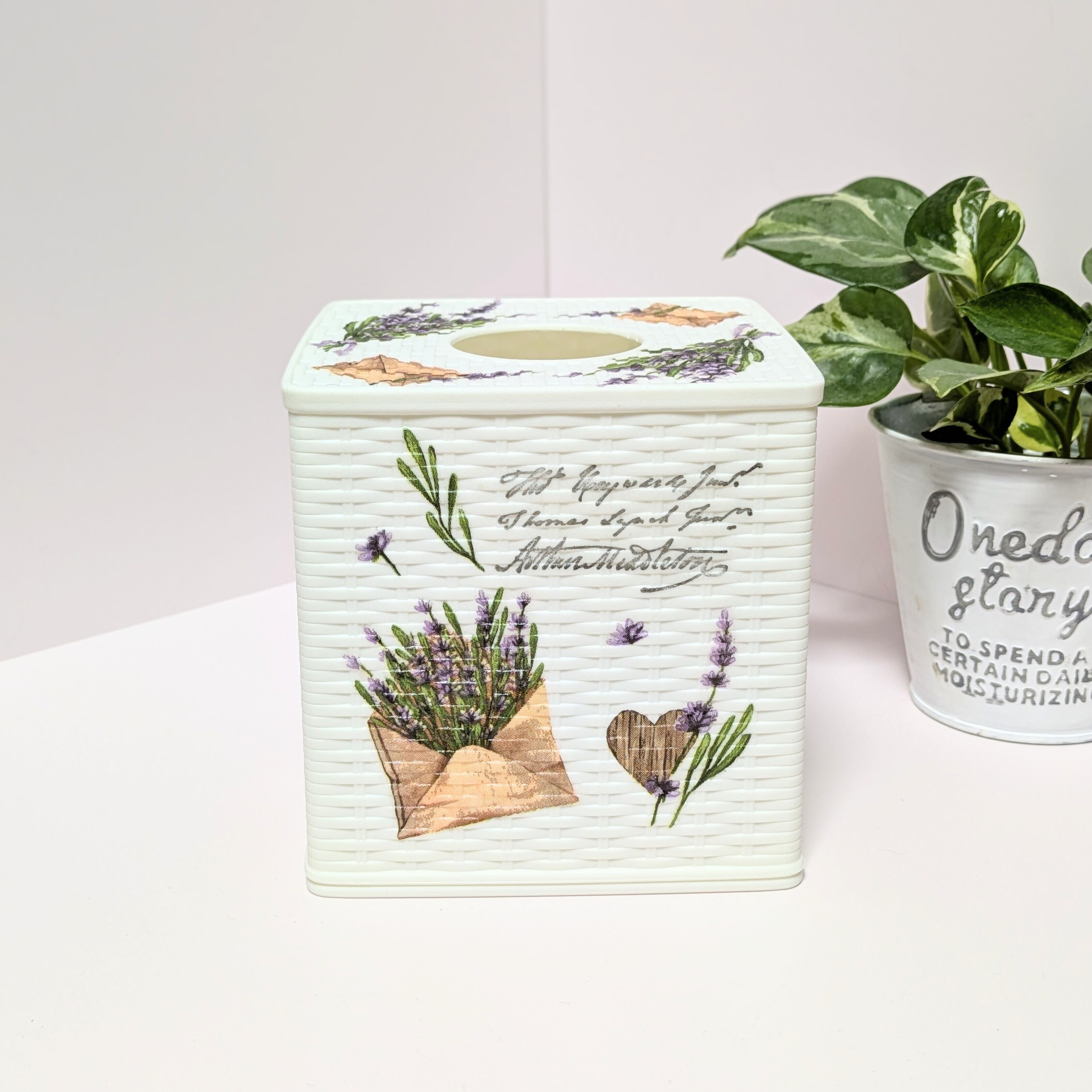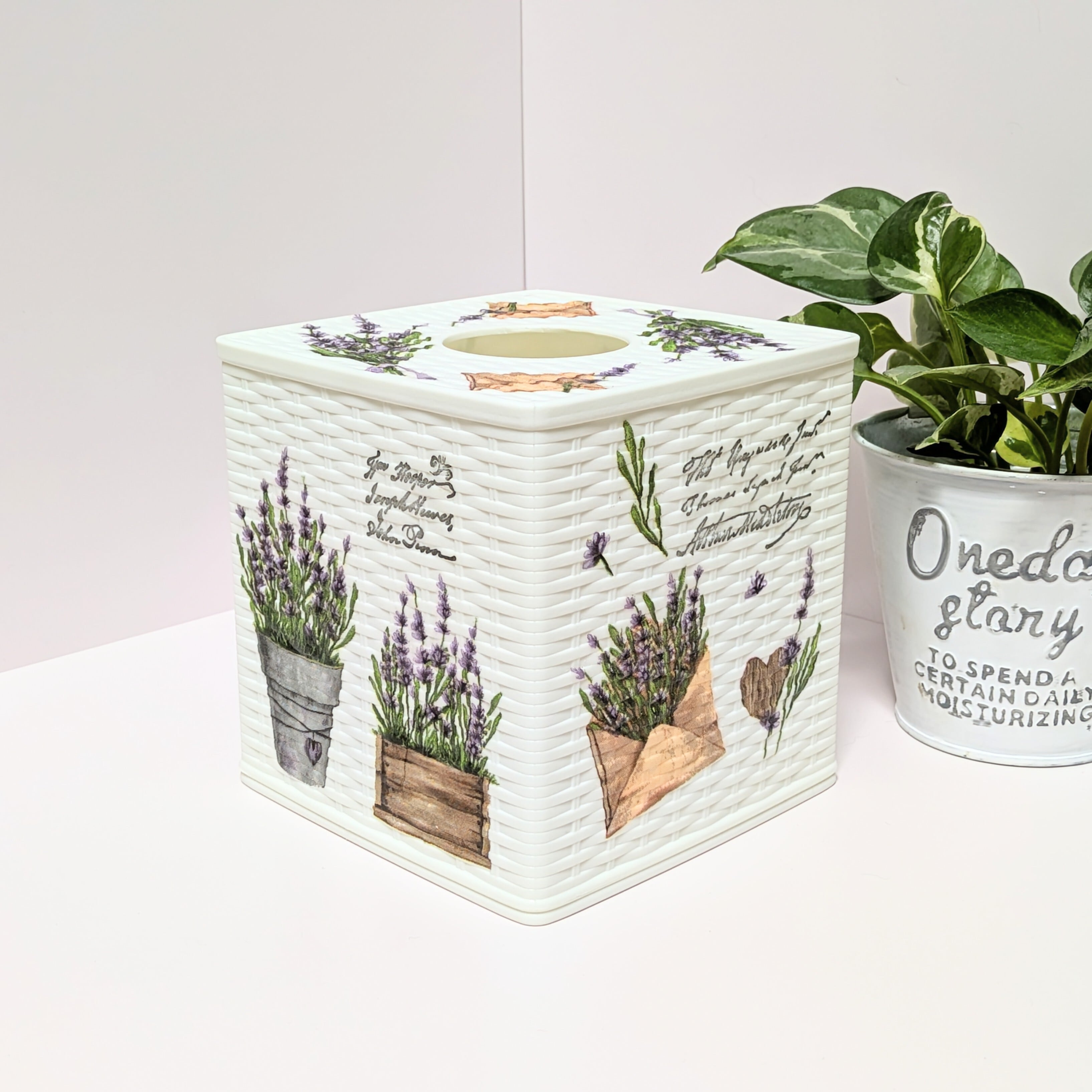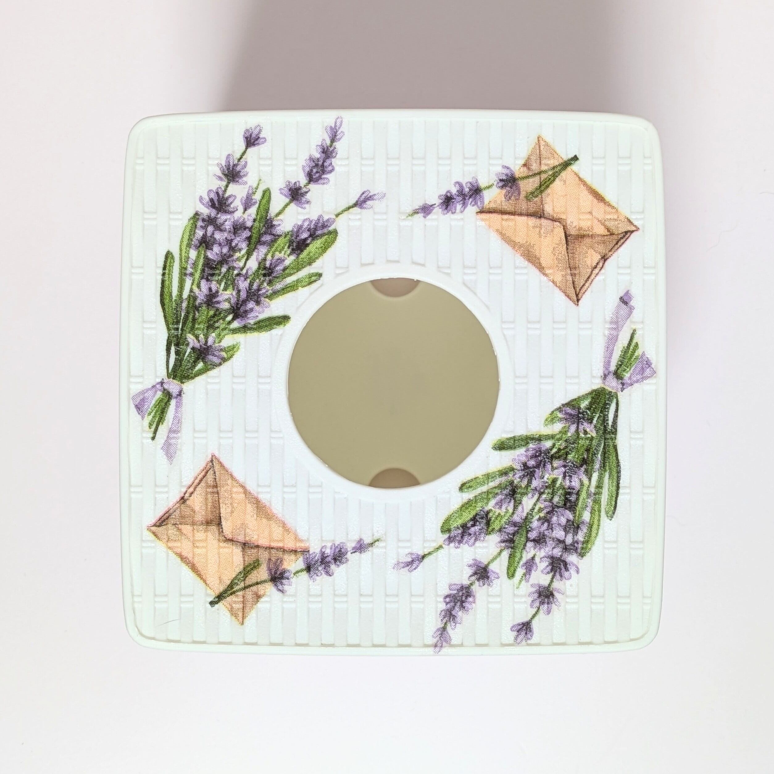 編み目調のティッシュケースにラベンダーの柄をデコパージュしました。