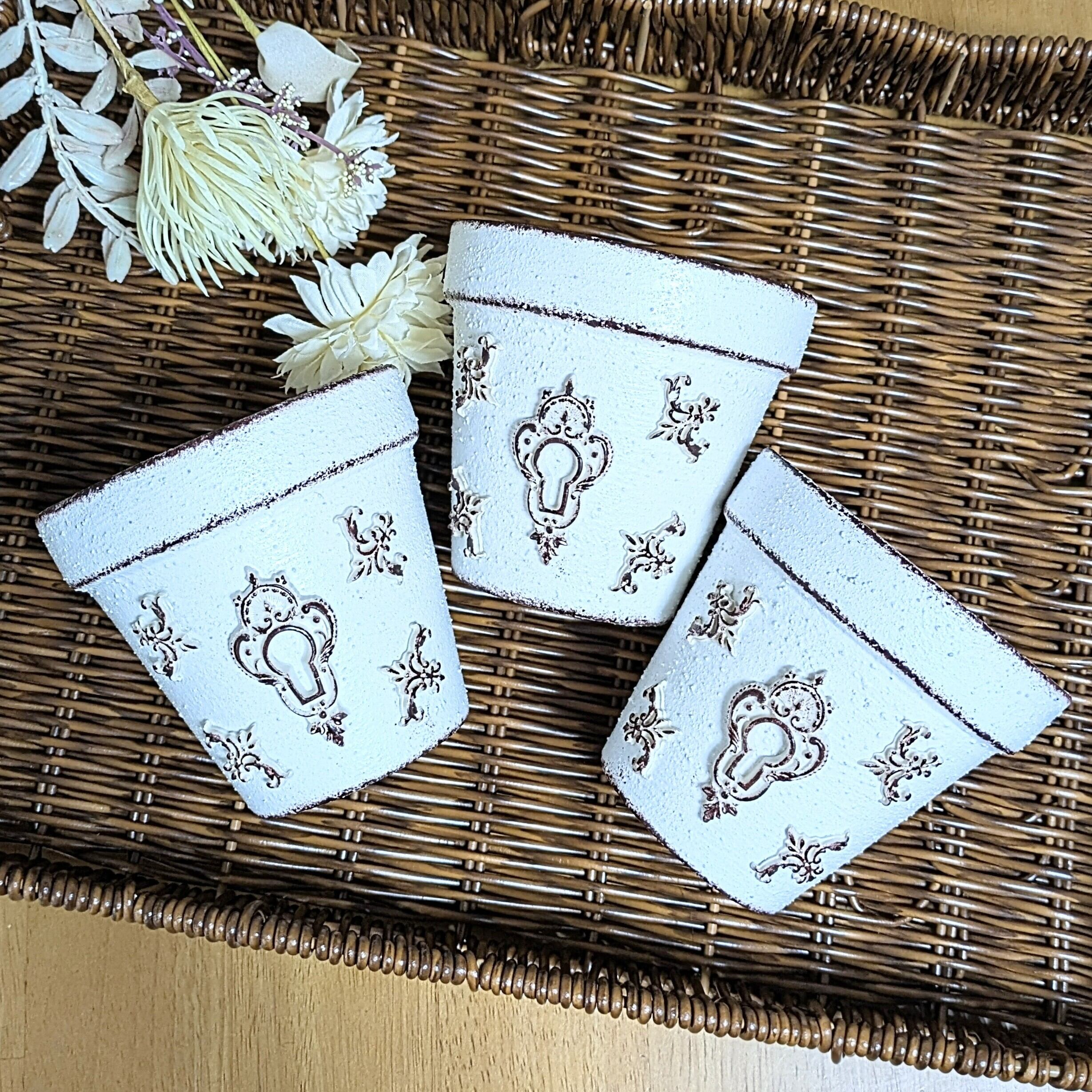 素焼き鉢にザラザラのペイントをし、アンティーク風に仕上げています。