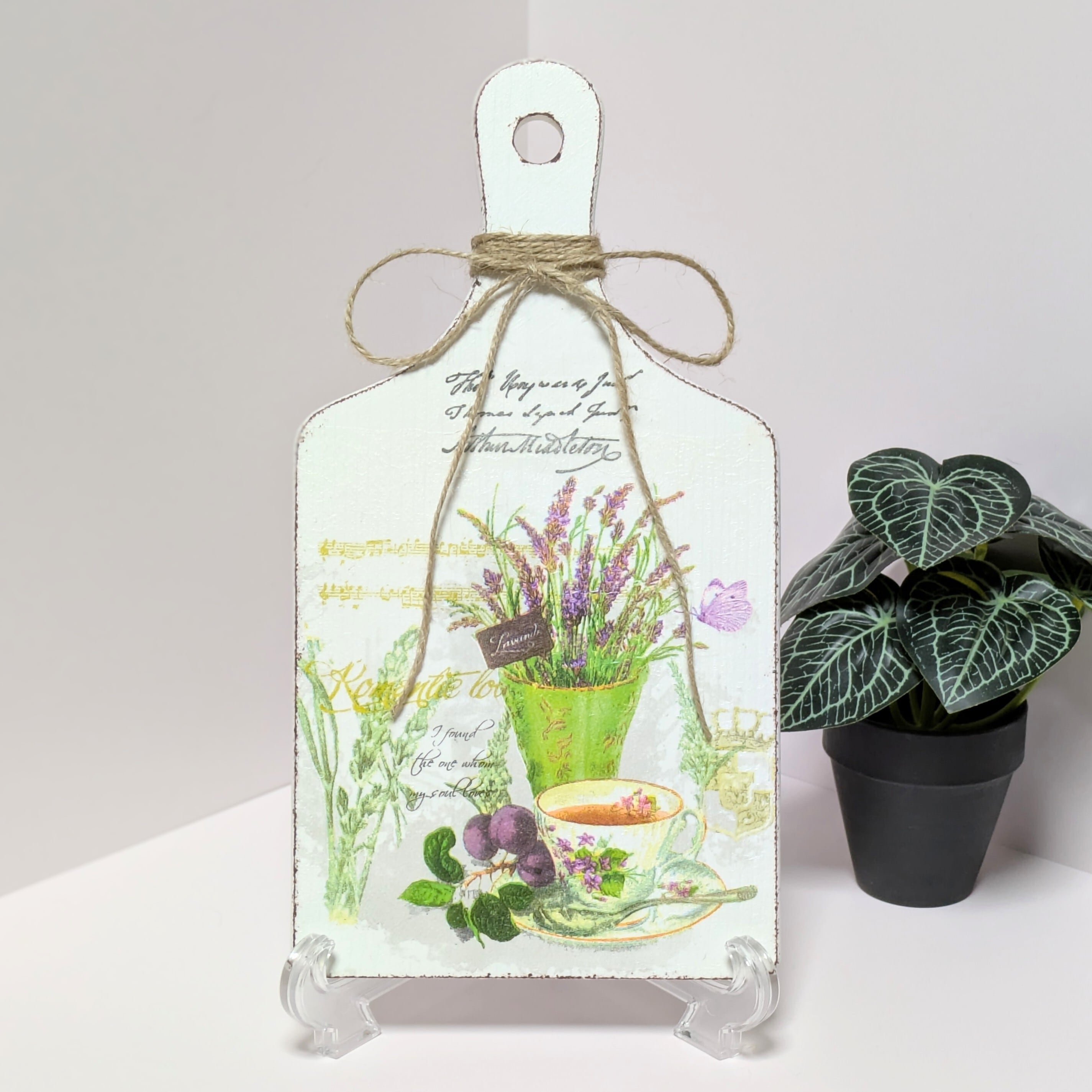 カッティングボードにデコパージュ、オリジナルロゴのステンシルをしました。