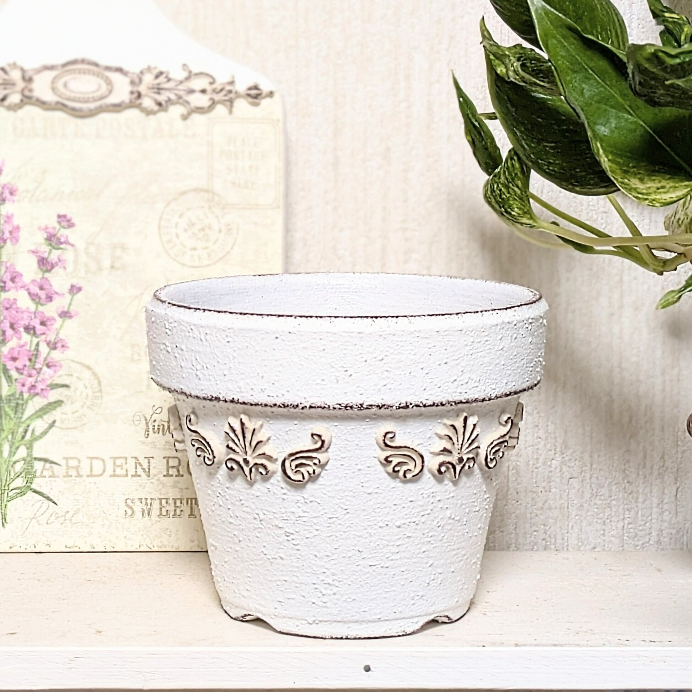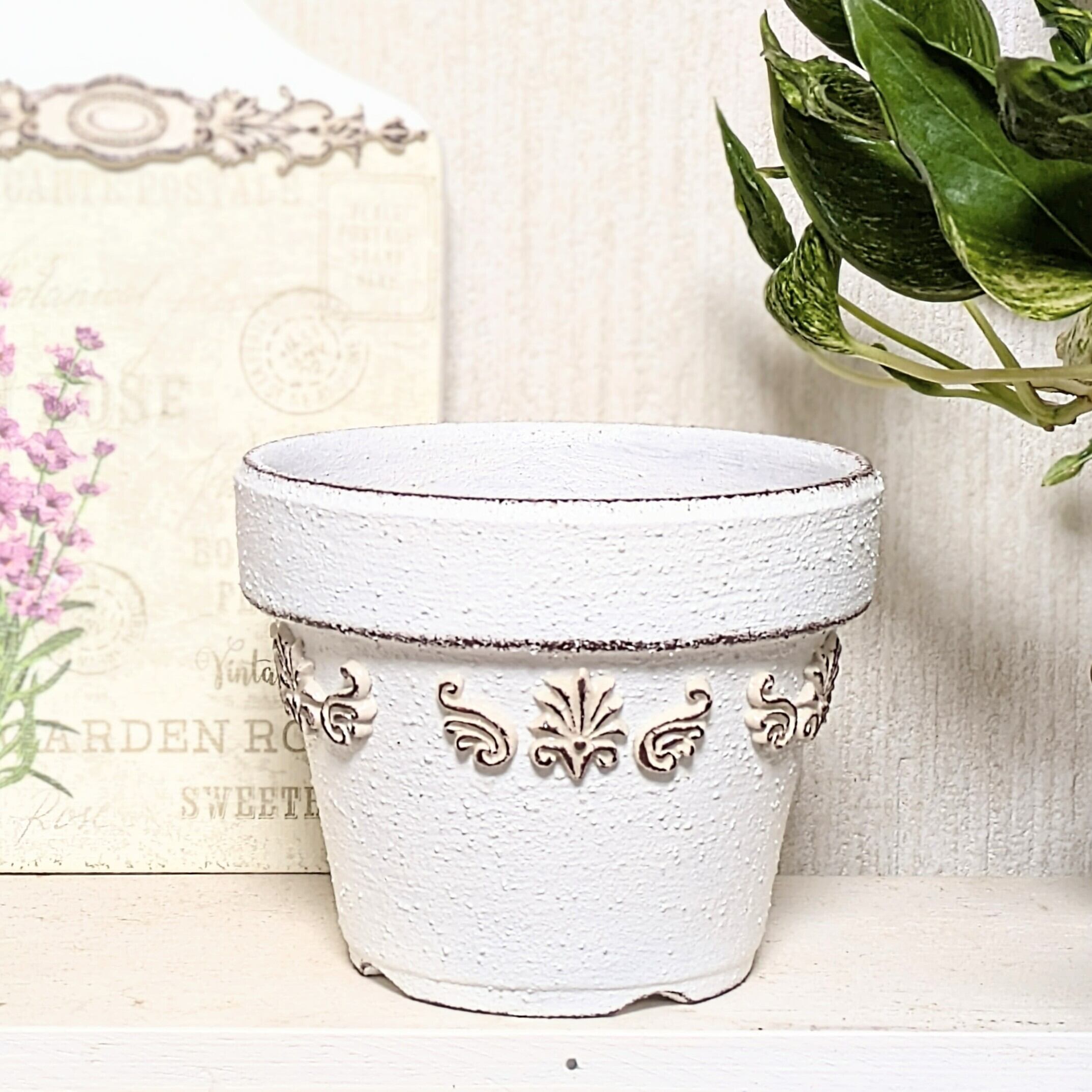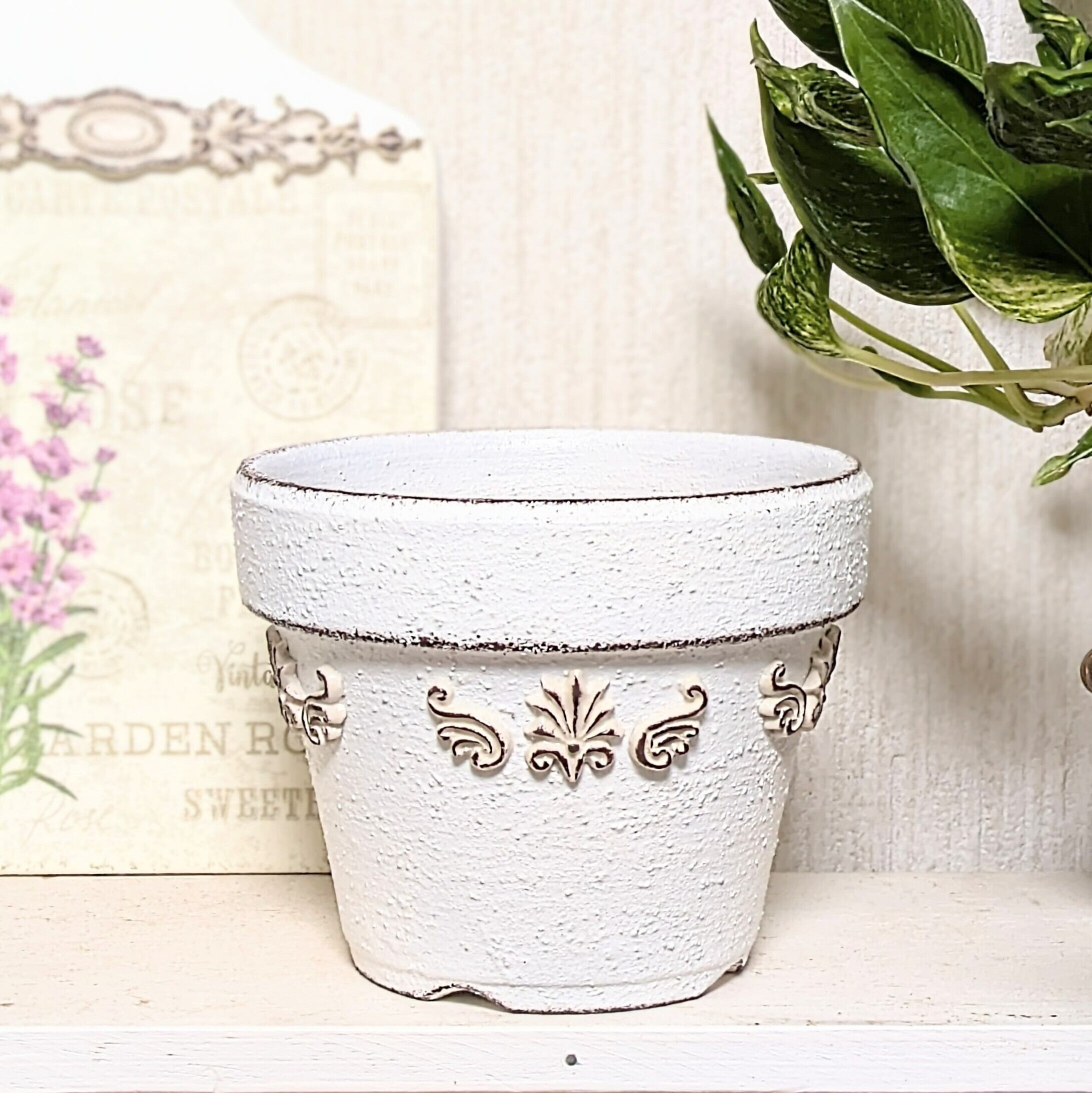 素焼き鉢にザラザラとした質感のペイントを施し、アンティーク風に仕上げました。