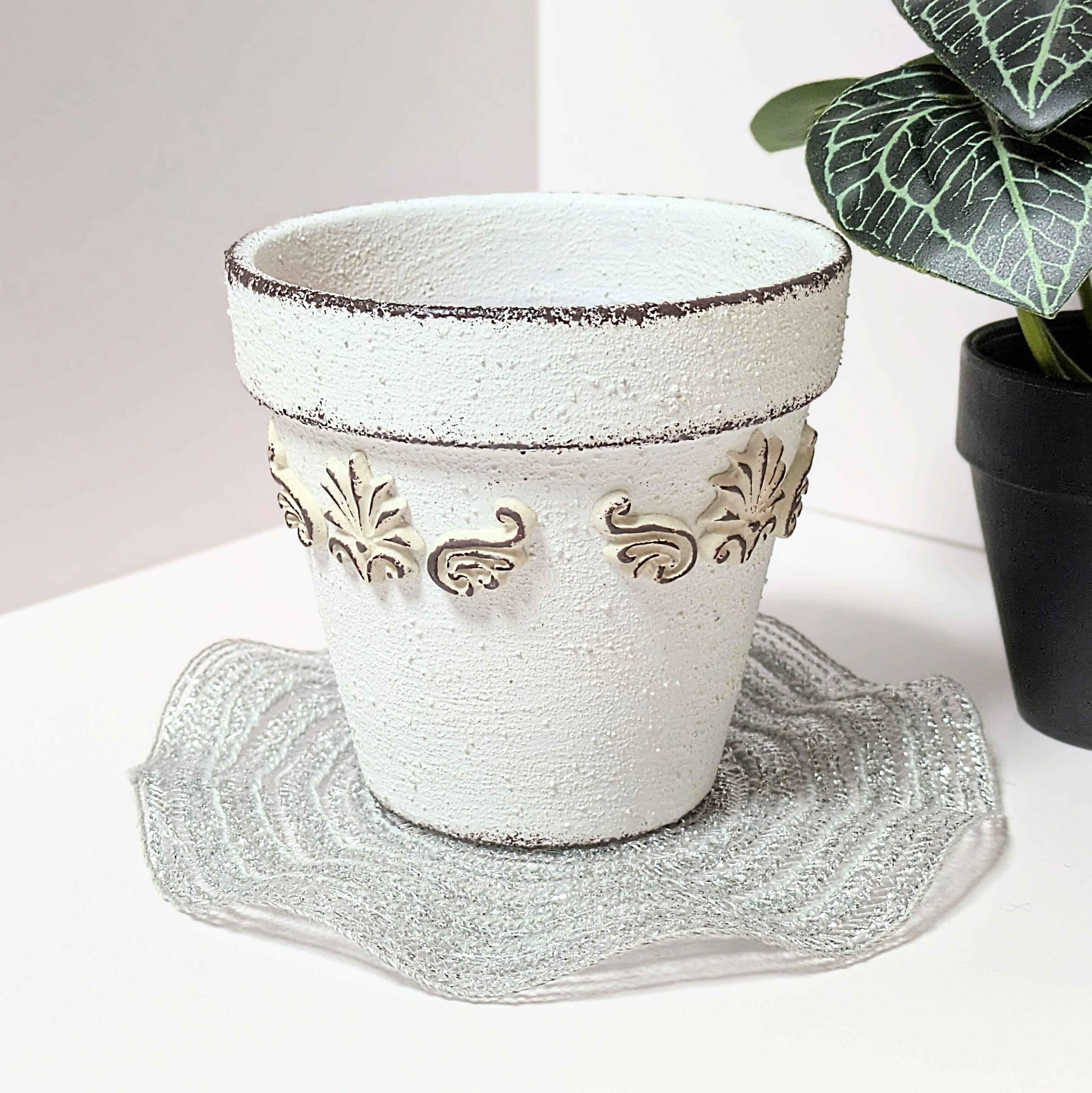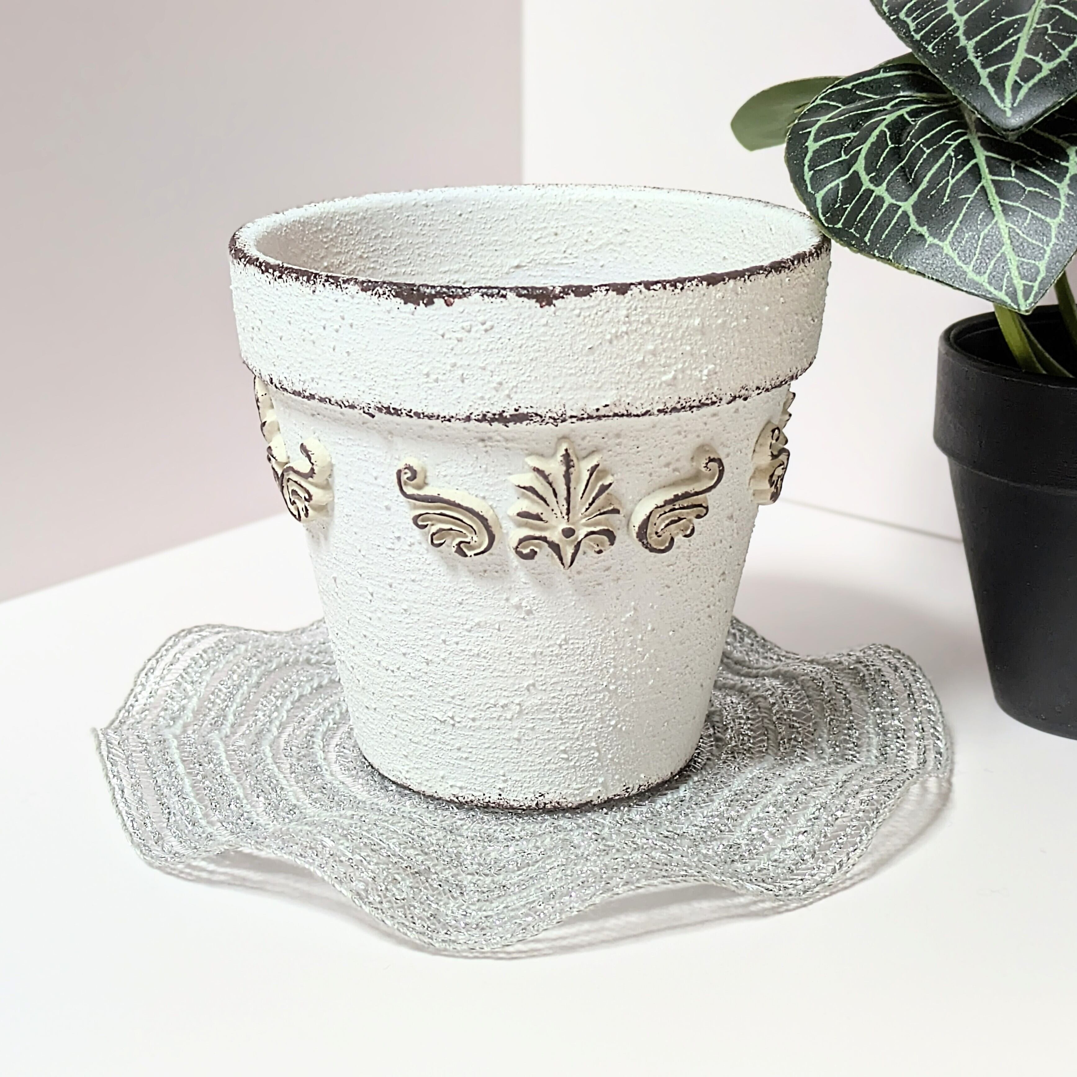 素焼き鉢にザラザラのペイントをし、アンティーク風に仕上げています。
