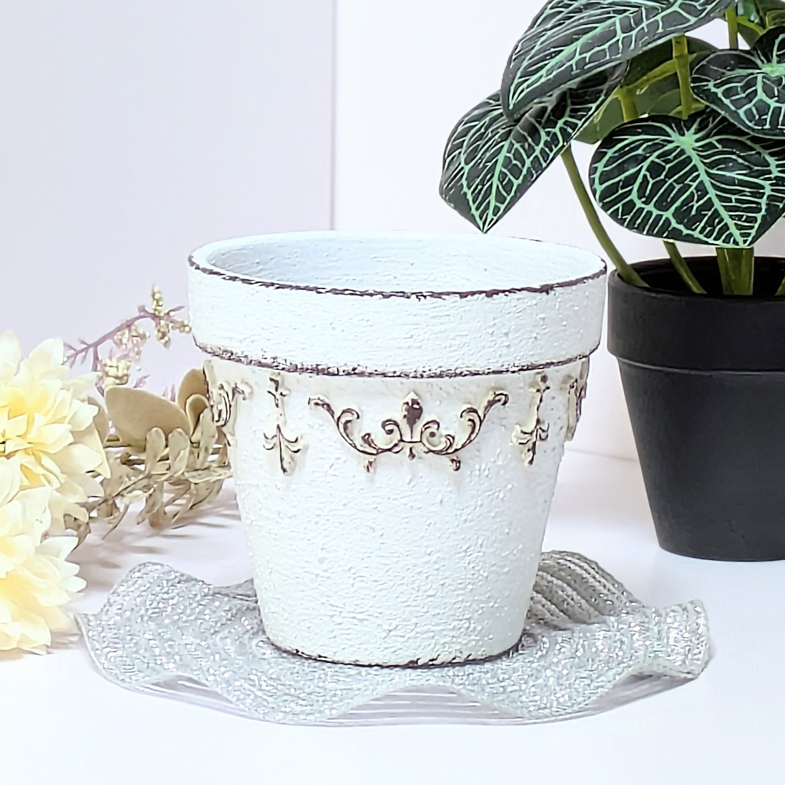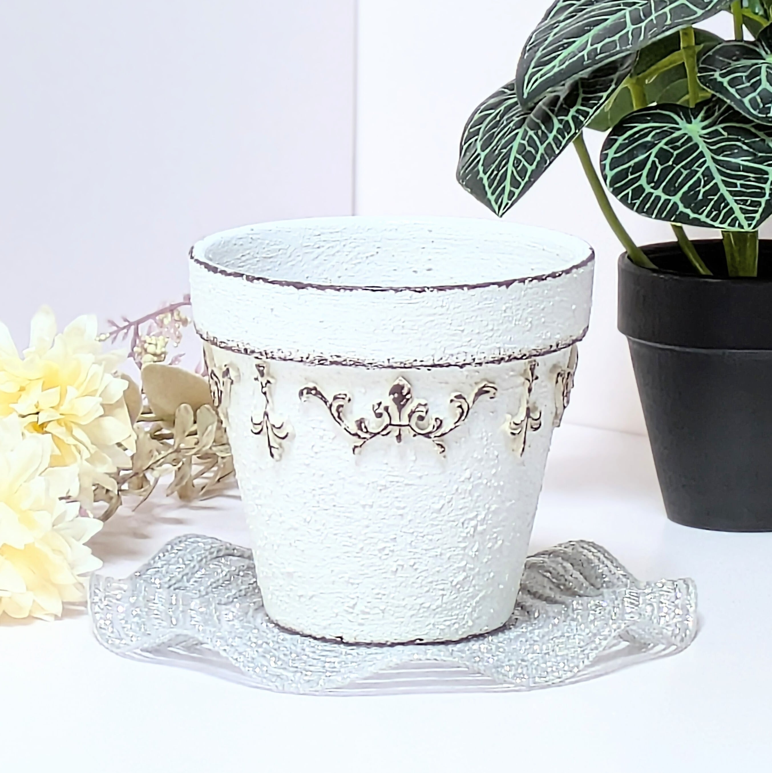 素焼き鉢にザラザラとした質感のペイントを施し、アンティーク風に仕上げました。