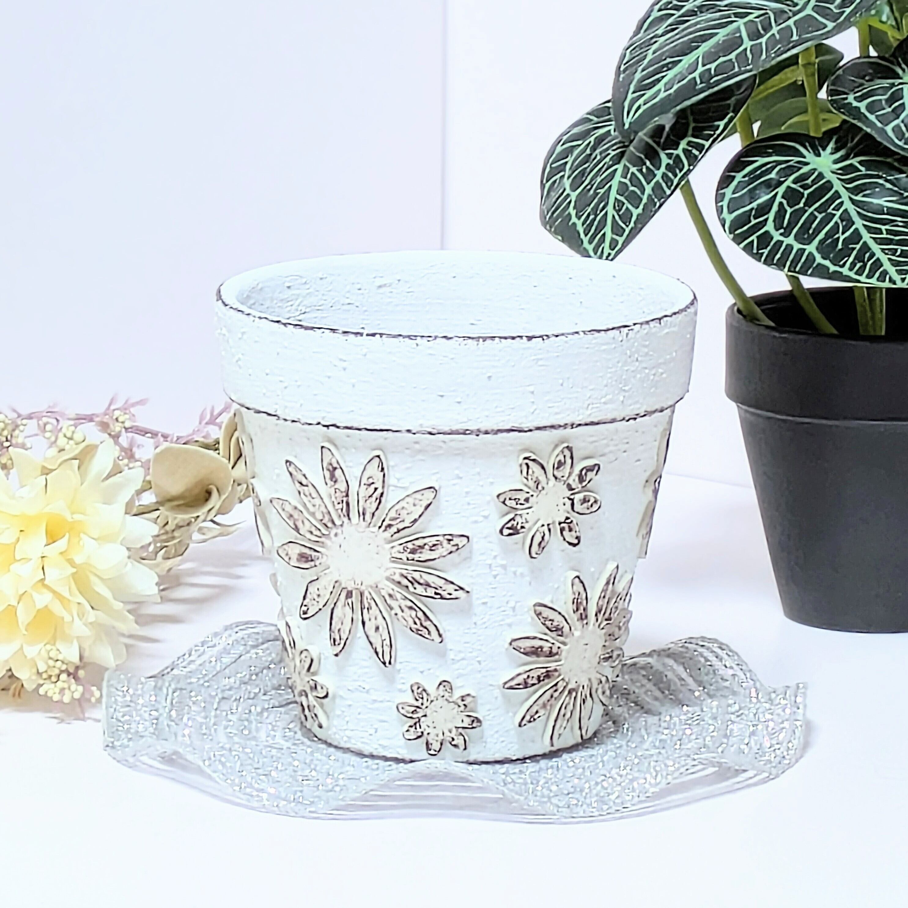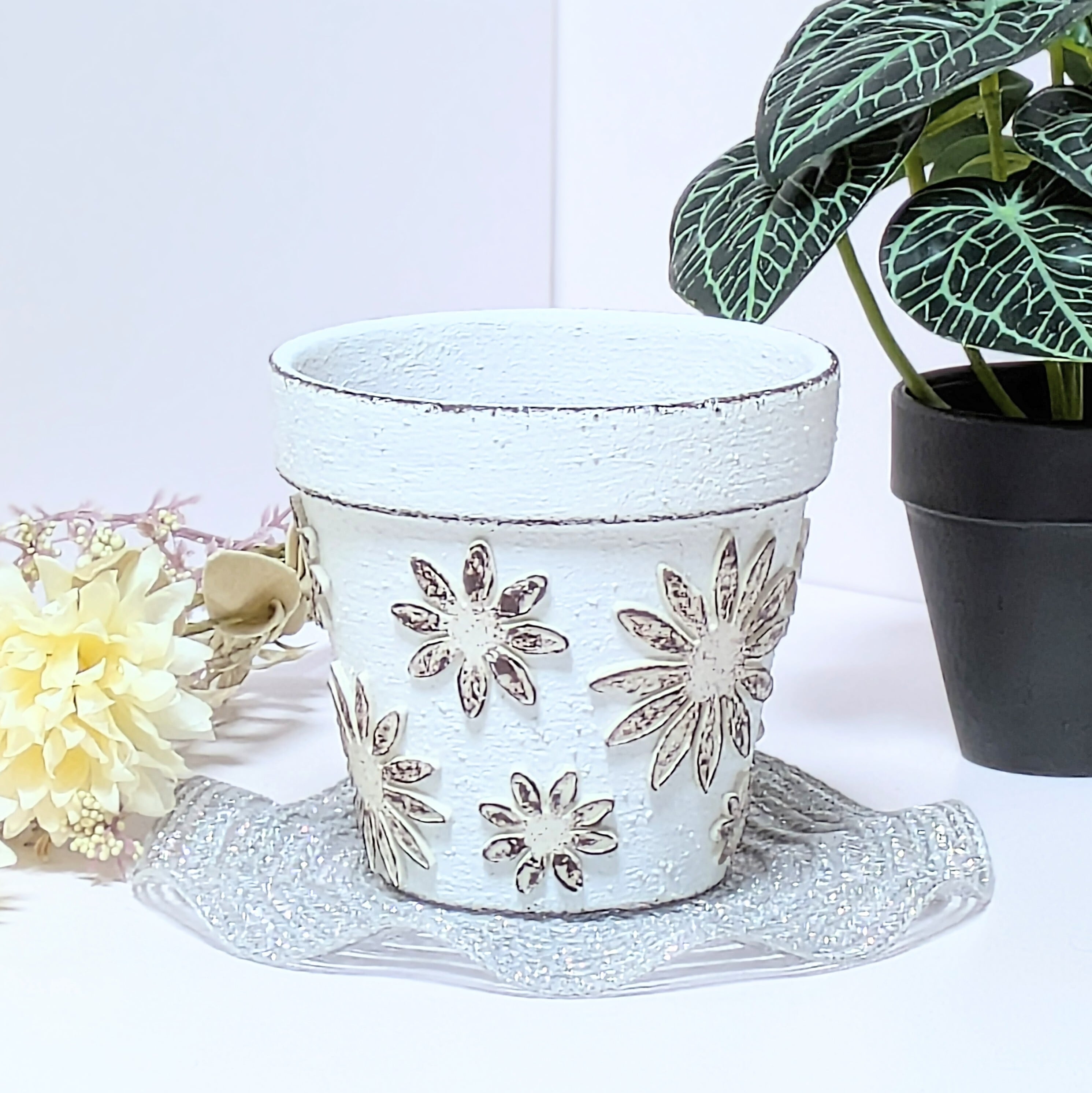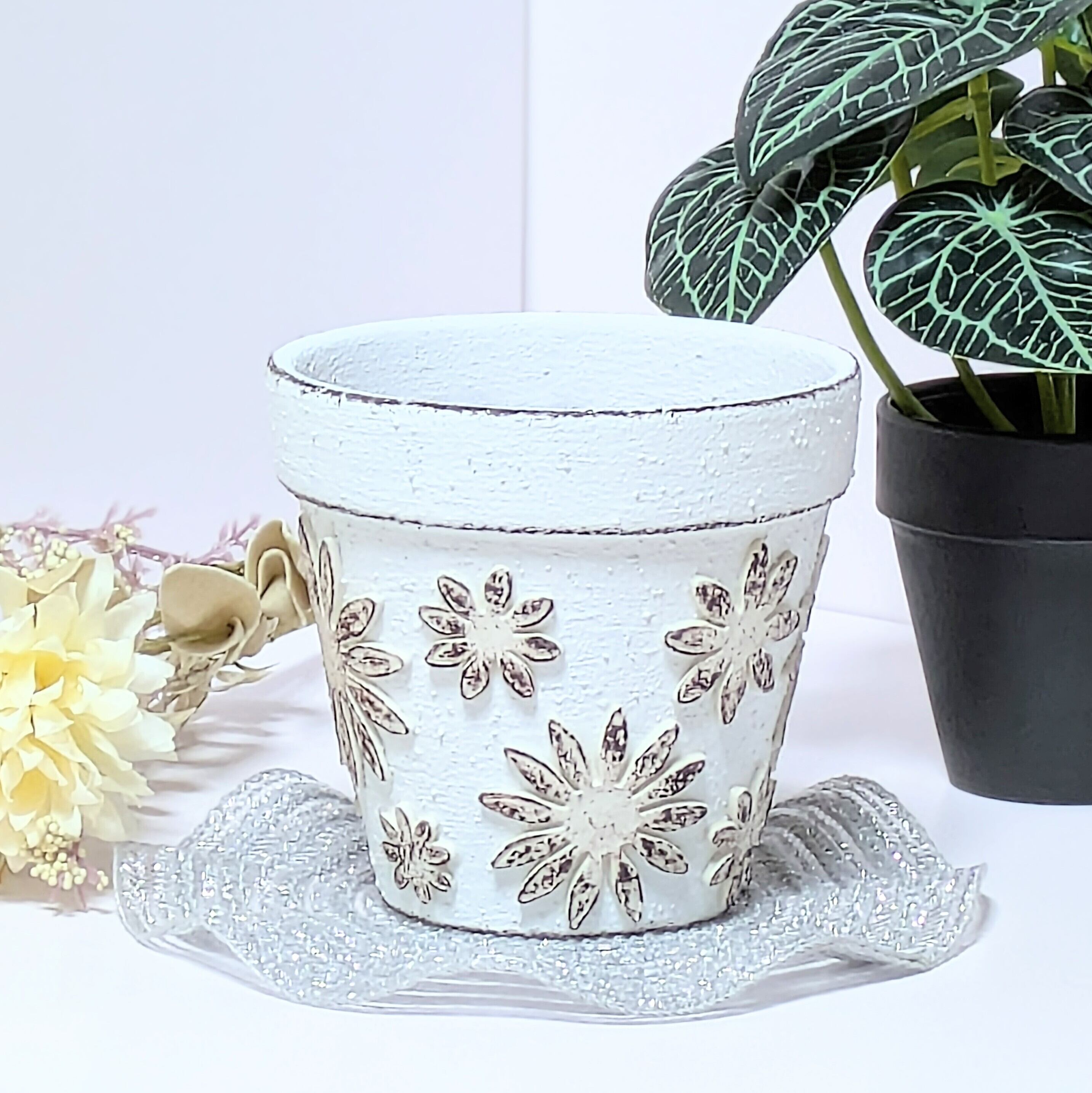 素焼き鉢にザラザラのペイントをし、アンティーク風に仕上げています。