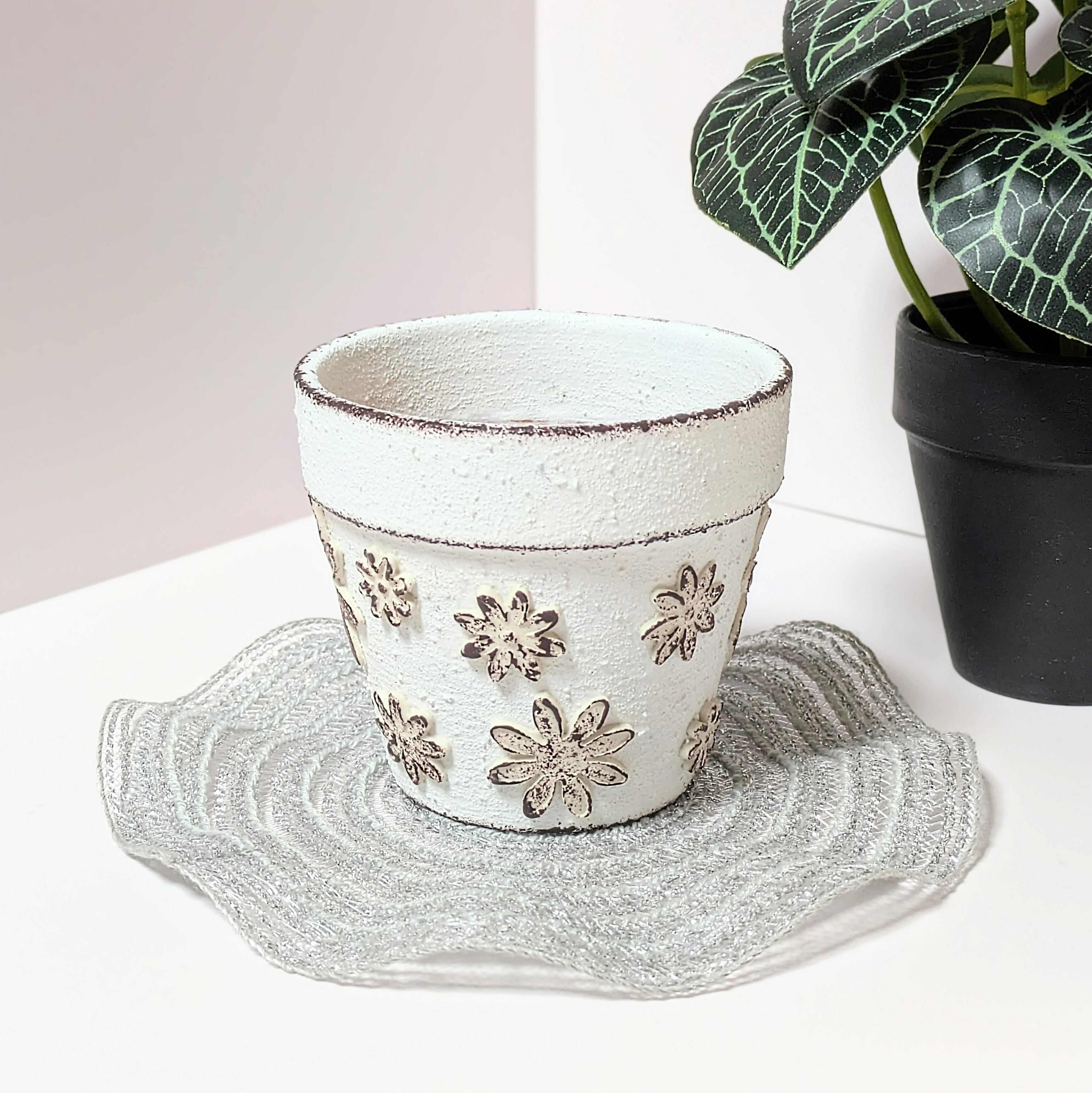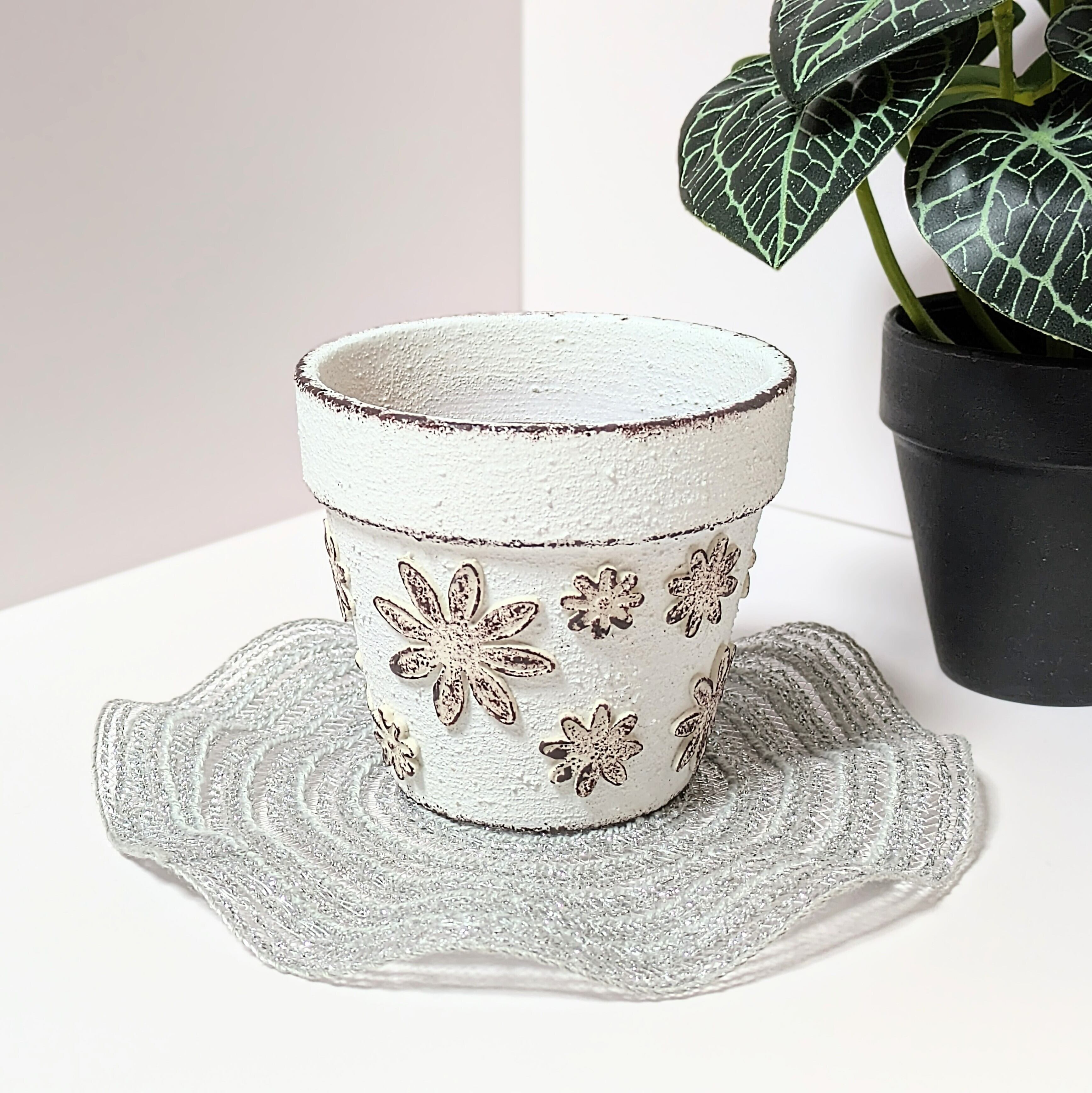素焼き鉢にザラザラとした質感のペイントを施し、アンティーク風に仕上げました。