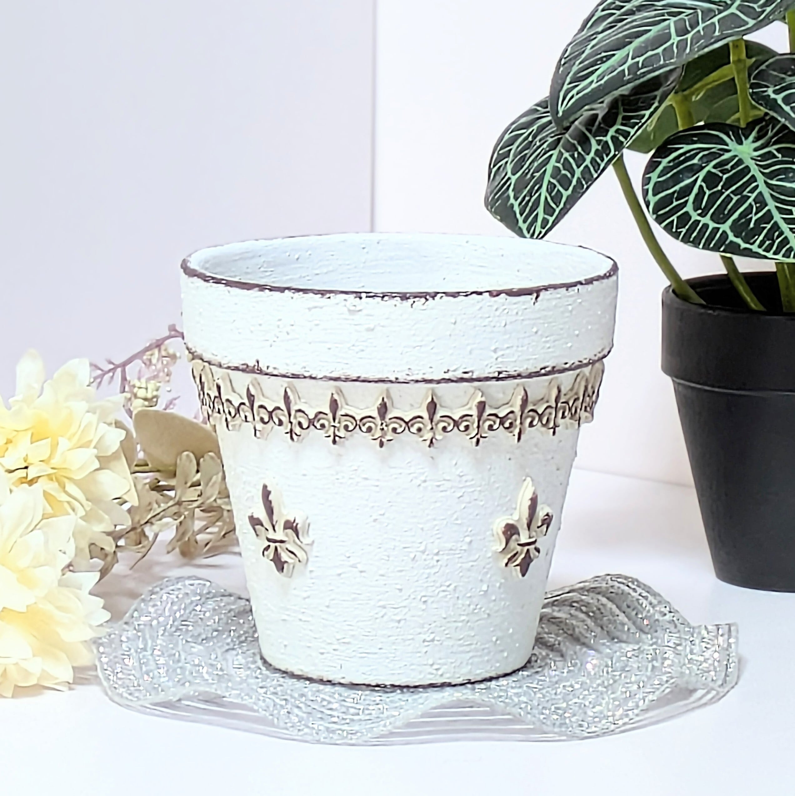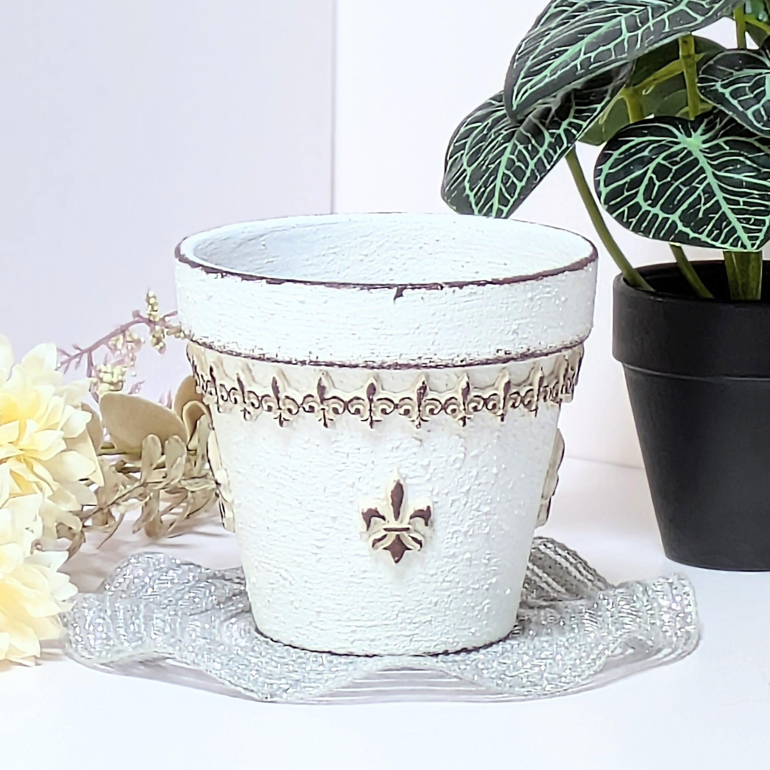 素焼き鉢にザラザラとした質感のペイントを施し、アンティーク風に仕上げました。