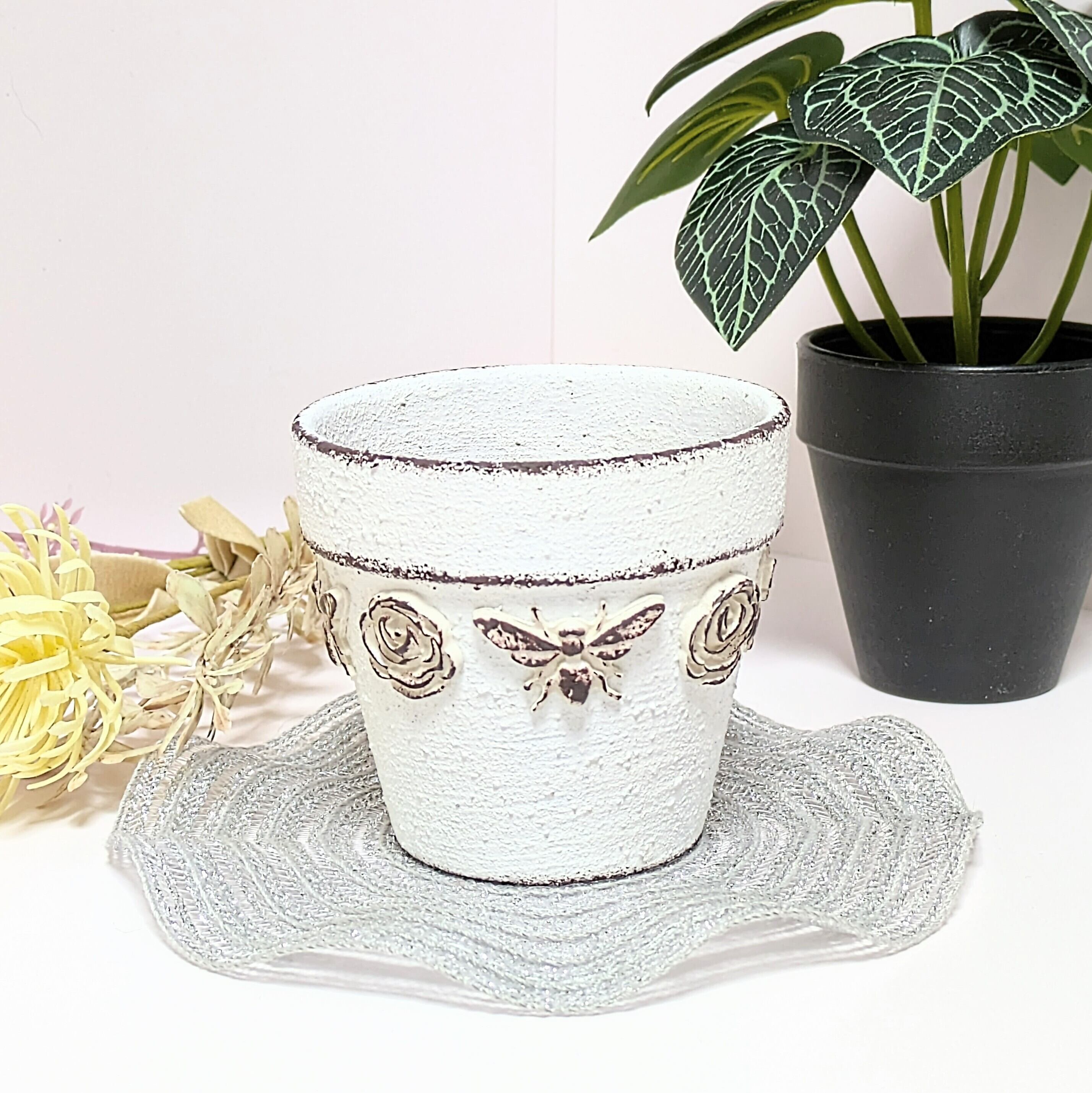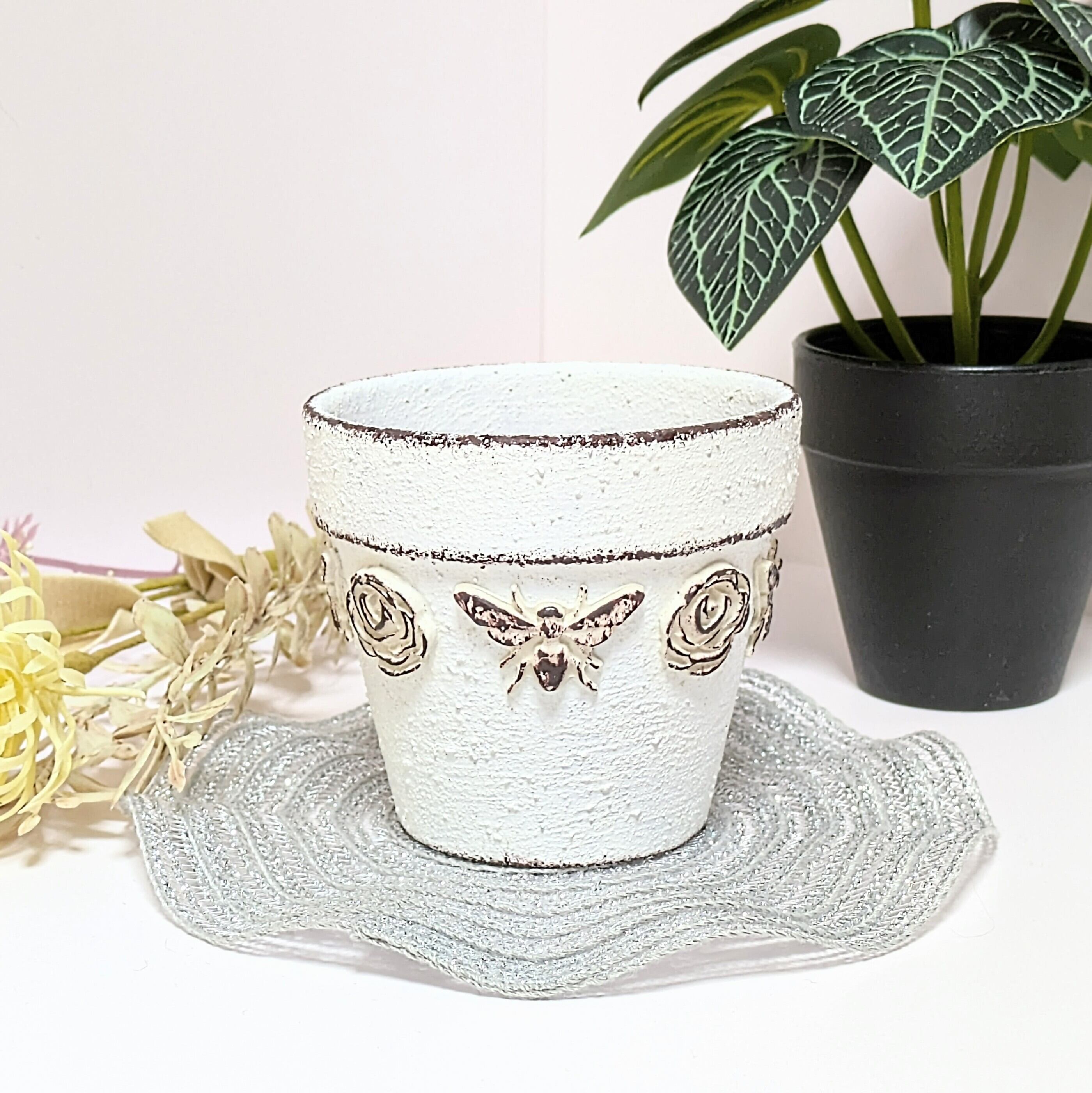 素焼き鉢にザラザラのペイントをし、アンティーク風に仕上げています。