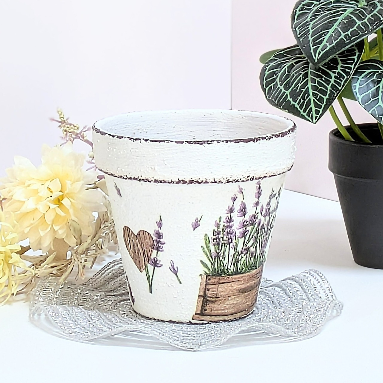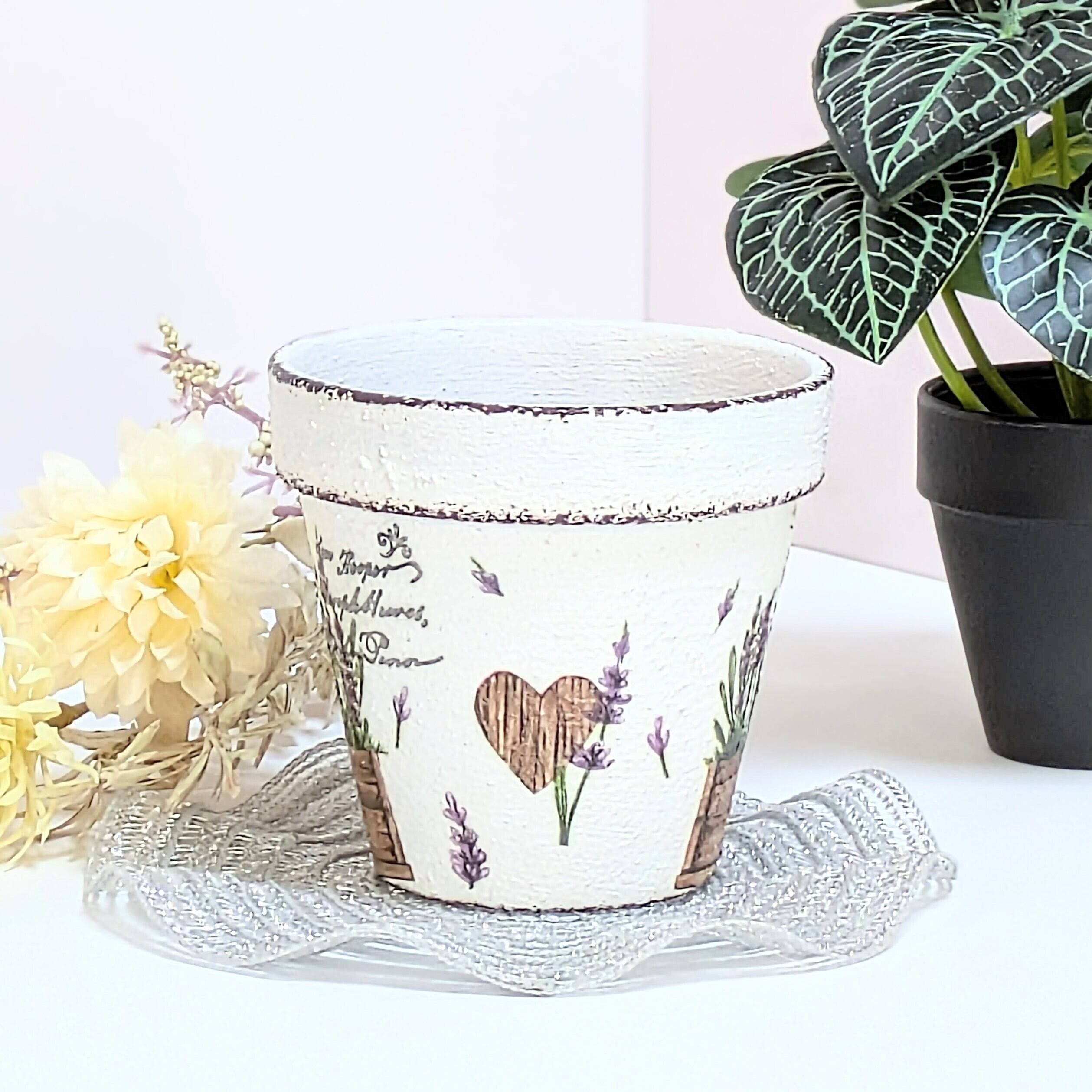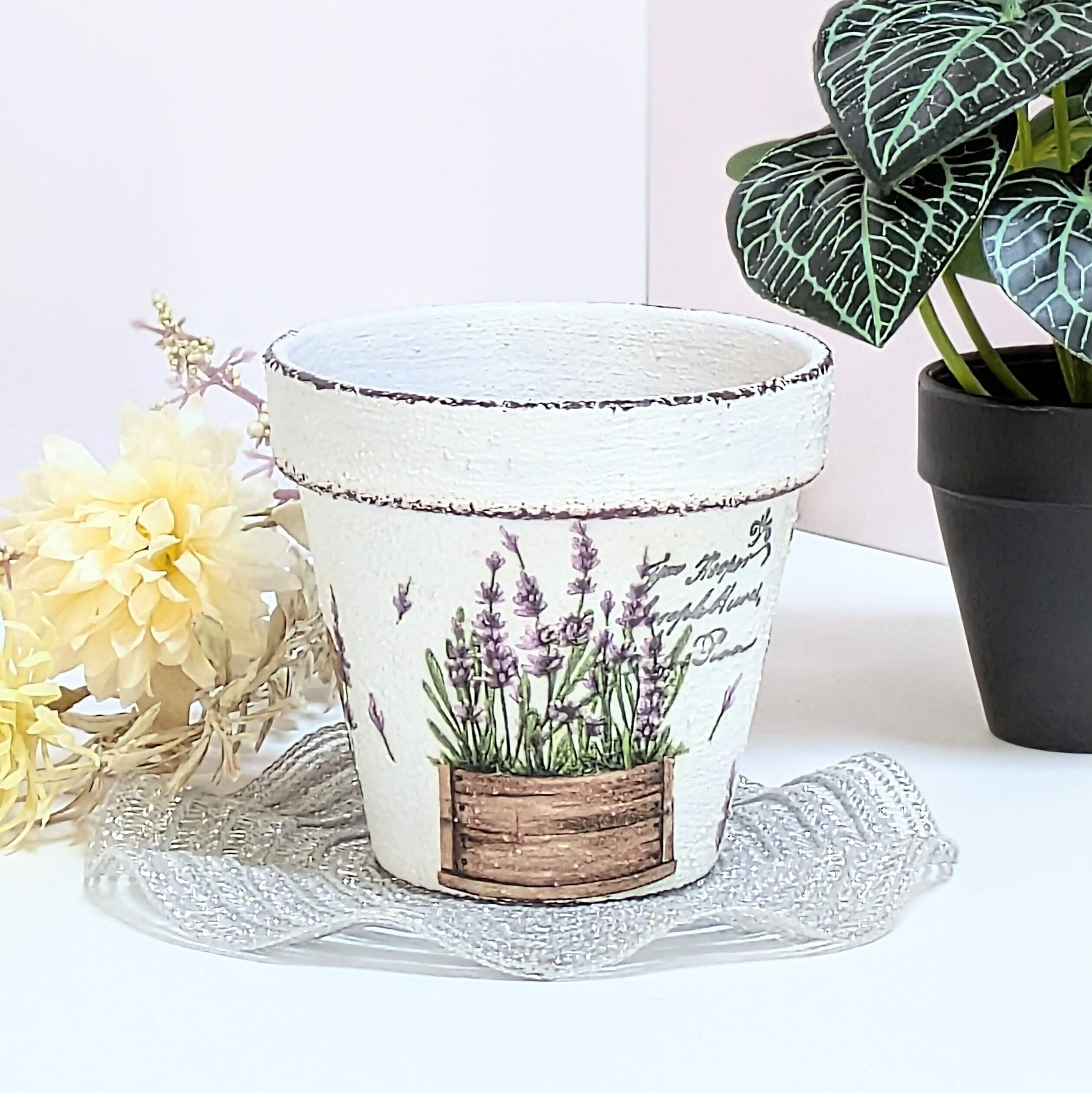 素焼き鉢にザラザラのペイントをし、ラベンダー柄をデコパージュしました。