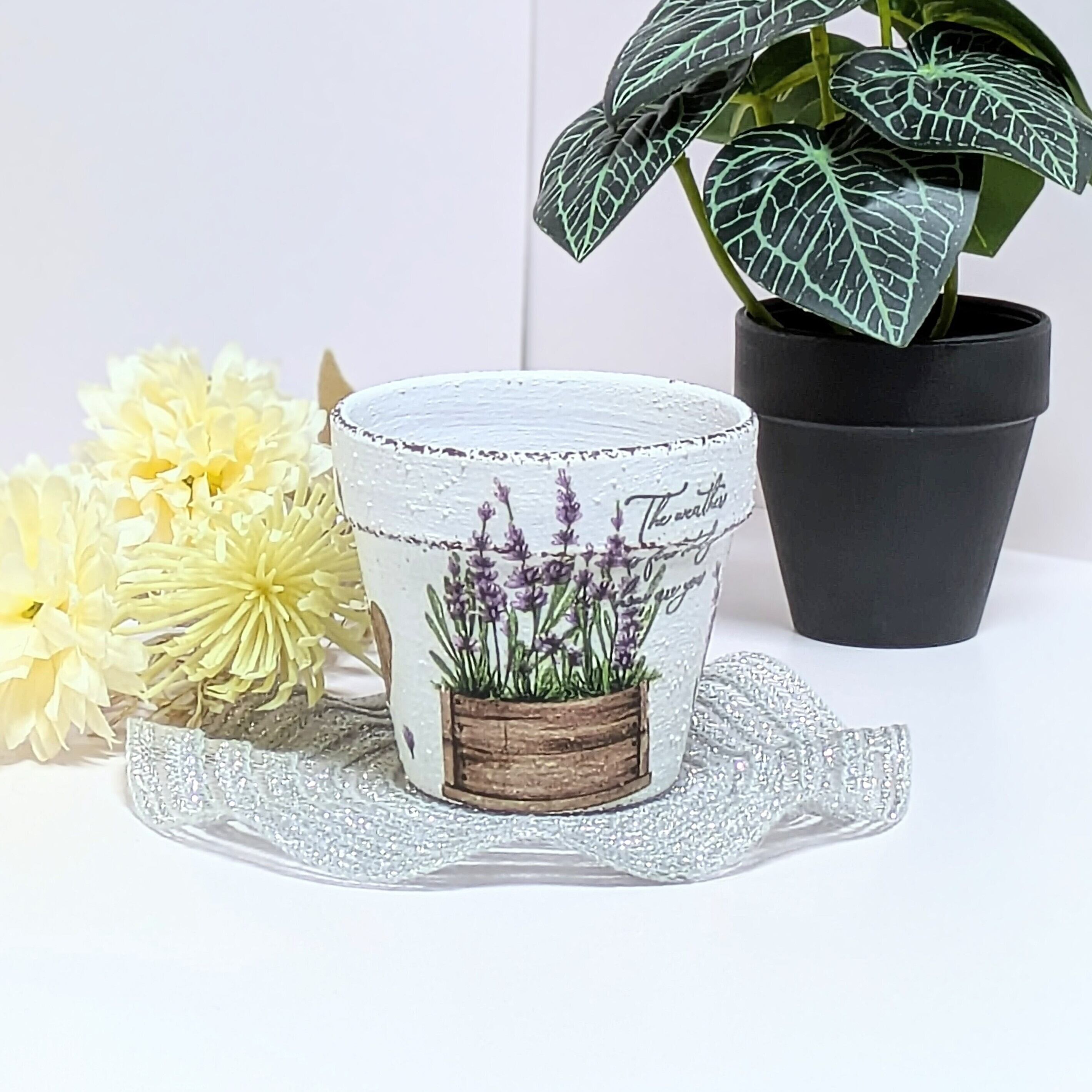 素焼き鉢にザラザラのペイントをし、ラベンダー柄をデコパージュしました。